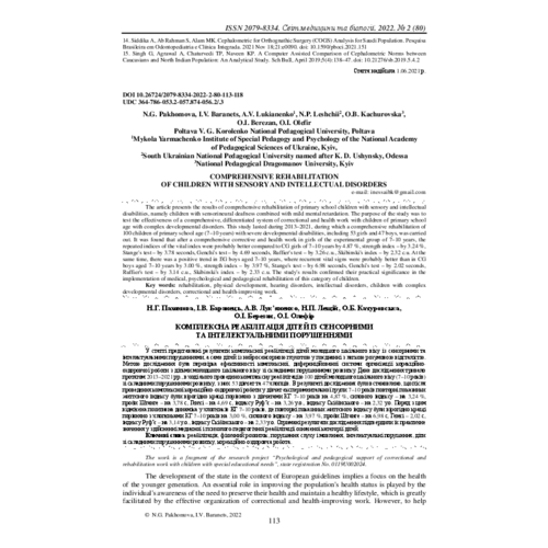 - Leshchiy NP, Pakhomova NG, Baranets IV, Kulbida SV, Yanovskaya TA, Sheremet MK, Suprun MO. Features of the physical and psycho-emotional state of children with. Svit Medytsyny ta Biolohiyi. 2021; 3(77): 91–96. DOI 10.26724/2079-8334-2021-3-77-91-96