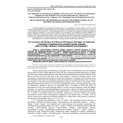 - Savchuk OV, Нasіuk NV, Klytynska OV, Yeroshenko G.A., Zaliznyak M.S. Clinical and morphological aspects of complex treatment of generalized periodontitis. Svit medytsyny ta biolohiyi. 2020; 2 (72):115‒119. doi: 10.26724/2079-8334-2020-2-72-115-119