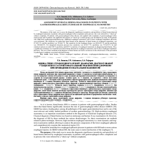 The purpose of the study was to assess the diagnostic significance (sensitivity and specificity) of hiatal hernia detected by esophageal manometry in patients with gastroesophageal reflux complaints and in persons who were referred for a “check-up” without complaints. 60 patients with gastroesophageal reflux disease who applied with complaints of gastroesophageal reflux (main group) and 35 patients who applied for the purpose of “check-up” (control group) were included in our study. In 95 patients who underwent esophagogastroduodenoscopy, additional esophageal manometry and 24-hour esophageal impedance pH-metry were performed. The sensitivity for endoscopic hiatal hernia in the diagnosis of hiatal hernia on esophageal manometry was 87.5±5.2 %, and the specificity was 70.9±6.1 %. The sensitivity for the esophagus biopsy was 88.9±10.5 %, and the specificity was 100.0±0.0 %. For integrated relaxation pressure-4sec sensitivity was 62.5±7.7 %, specificity was 75.5±5.9 %. In total statistical analysis revealed 100 % specificity and 88.9 % sensitivity of esophageal manometry in diagnosing hiatal hernia. Thus, a significant correlation was found between hiatal hernia detected on esophageal manometry and 24-hour esophageal impedance pH-metry. The use of these methods in the diagnosis of hiatal hernia can lead to an increase in the effectiveness of the prevention of pathological conditions associated with hiatal hernia. |