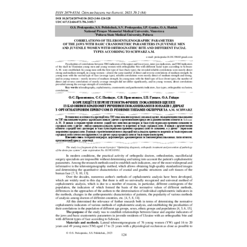 - Prokopenko OS, Beliaiev EV, Kravets RA, Marynych LI, Prokopenko SV. Correlations of teleroentgenographic parameters of the jaws with basal cranial parameters in Ukrainian juvenile men and juvenile women with different facial profiles according to Schwarz. World of Medicine and Biology. 2022;3(81):132–7. doi: 10.26724/2079-8334-2022-3-81-132-137