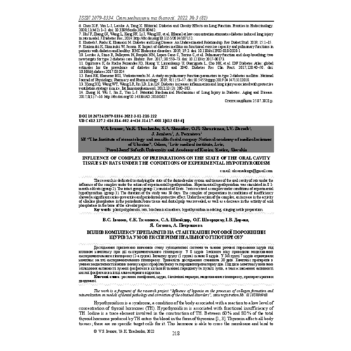 - Ivanov VS, Dienha OV, Shnaider SA, Pyndus TO, Pyndus VB, Shchepanskyy FY. Correction of metabolic changes of tissues of rats oral cavity by complex of preparations under conditions of intrauterine hypoxia and cariogenic diet. World of Medicine and Biology. 2021;4(78):213–218. DOI: 10.26724/2079-8334-2021-4-78-213-218