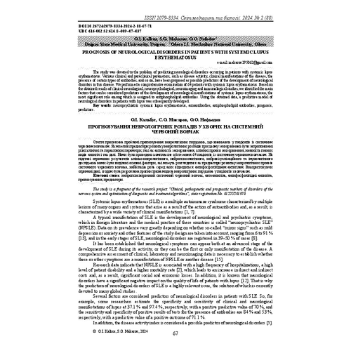 Стаття присвячена проблемі прогнозування неврологічних порушень, що виникають у пацієнтів із системним червоним вовчаком. Як можливі предиктори розвитку неврологічних розладів при цьому захворюванні були запропоновані різні клінічні та параклінічні параметри, такі як активність захворювання, клінічні прояви захворювання, наявність певних видів антитіл і так далі. Нами було проведено комплексне обстеження 64 пацієнтів із системним червоним вовчаком. На підставі отриманих результатів клініко-неврологічного, нейропсихологічного, нейровізуалізаційного та імунологічного досліджень нами були виділені основні фактори, які можуть розглядатися як предиктори розвитку неврологічних проявів системного червоного вовчака, найбільша роль серед яких відводиться антифосфоліпідним антитілам. Використовуючи отримані дані, згодом була розроблена прогностична модель неврологічних порушень у пацієнтів з вовчаком. |