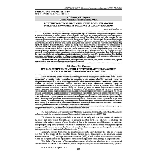 Метою дослідження було вивчення патофізіологічних механізмів порушення регуляції азотного обміну у тварин після впливу різних доз іонізуючого випромінювання. Щурів-самців лінії Вістар піддавали впливу іонізуючого опромінення. В печінці, крові, скелетному та серцевому м’язах тварин визначали активність аланін- та аспартатамінотрансферази. У сечі та у крові щурів визначали вміст загального азоту та його компонентів. Отримані дані свідчать, що іонізуюче опромінення викликає виражене дозо-залежне пригнічення активності аланін- та аспартатамінотрансферази у мітохондріальних і цитоплазматичних фракціях печінки та серцевого м’яза. Найбільш помітні порушення спостерігались при дозі 5,82 Гр, що свідчить про значне виснаження функціонального потенціалу клітин і розвиток енергетичної недостатності. У скелетному м’язі зниження активності стосувалося переважно мітохондріальної фракції, тоді як цитоплазматичні показники залишалися відносно стабільними, що свідчить про більшу стійкість цієї тканини до радіаційного впливу. У крові відмічалося достовірне підвищення активності трансаміназ, що свідчить про розвиток системного цитолізу і може бути використане як маркер тяжкості радіаційного ураження. Окрім цього, опромінення супроводжувалося зниженням добового діурезу на фоні значного підвищення екскреції загального азоту з сечею та різким зростанням інтенсивності білкового розпаду. Отримані дані свідчать про комплексне ураження обміну речовин і функціонального стану життєво важливих органів під впливом іонізуючого випромінювання. Виявлені зміни можуть бути використані як інформативні біомаркери для ранньої діагностики, прогнозування і моніторингу тяжкості радіаційного ураження та ефективності радіопротекторних заходів. |